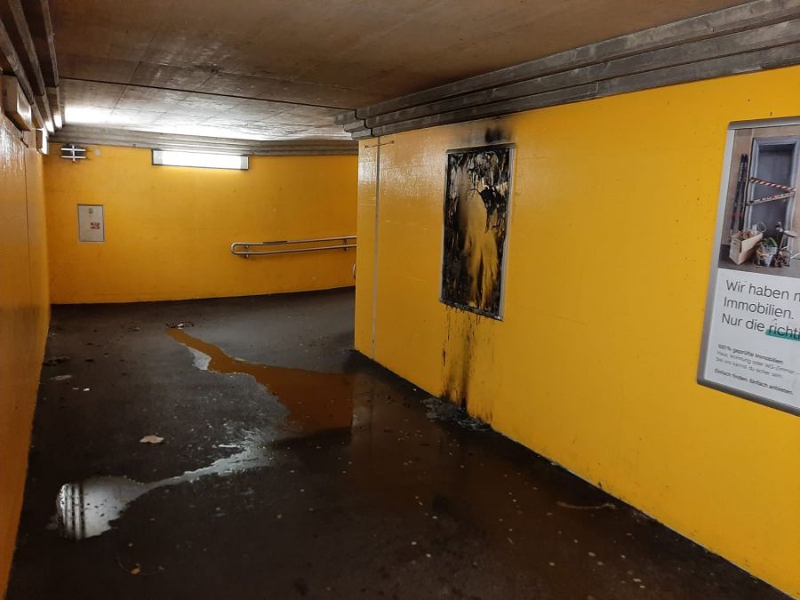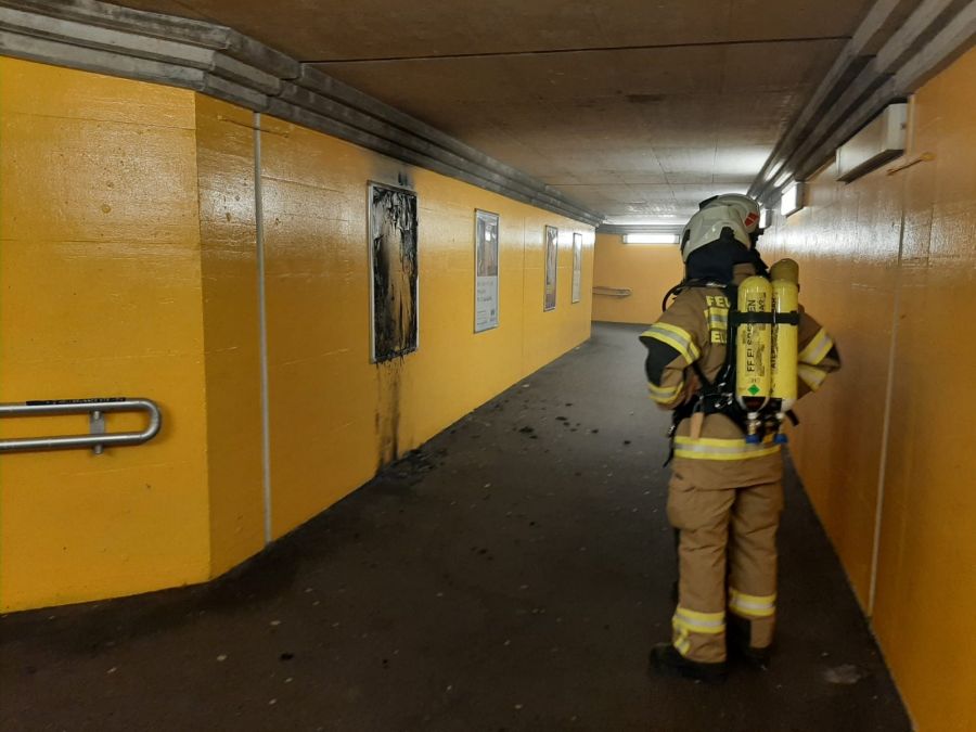 In der Bahnhofsunterführung brannte ein Plakat, dieses konnte von den Einsatzkräften mittels Feuerlöscher schnell gelöscht werden. Anschließend wurde die Unterführung noch mittels Drucklüfter belüftet.